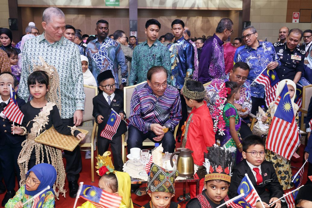 安华上台发表首相国庆日献词前,与学前教育的各族小朋友打成一片。站者左一为法迪拉。(黄安健摄)