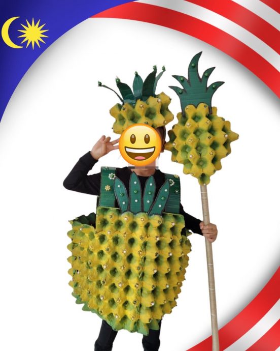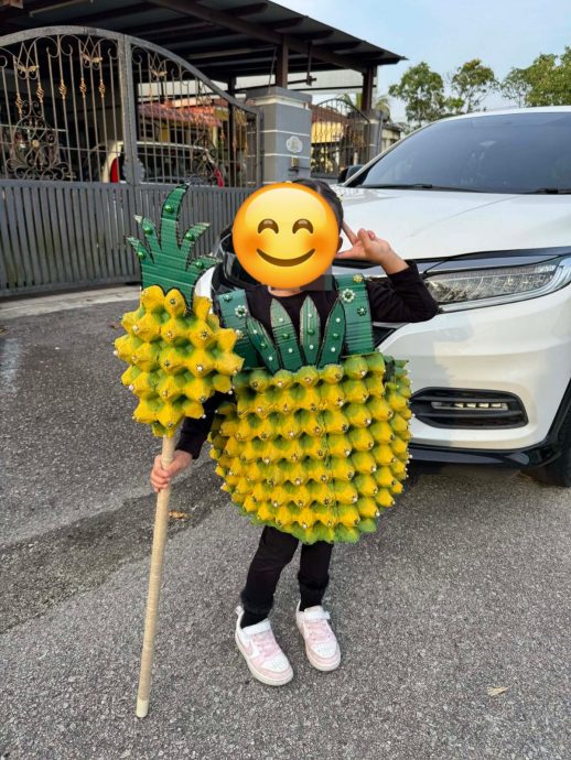 (八打灵再也30日讯)一名家长在网上分享自己为孩子制作的国庆主题水果服装——黄梨衣,成品让网民们感到惊艳。