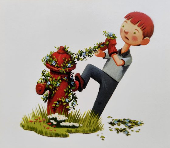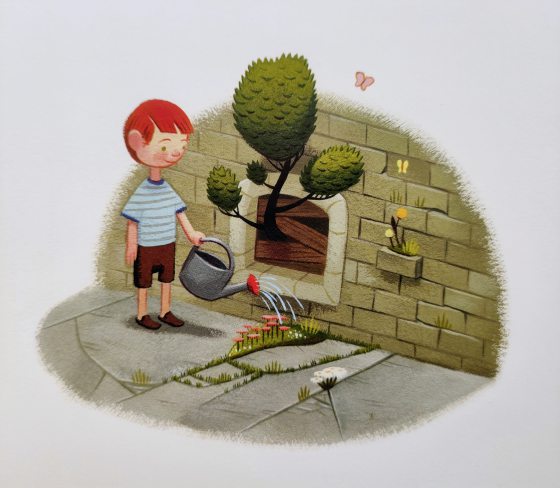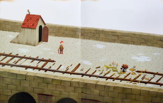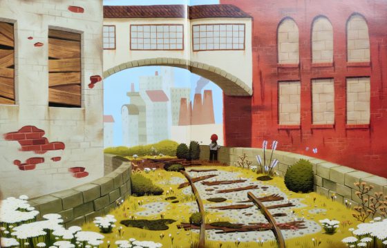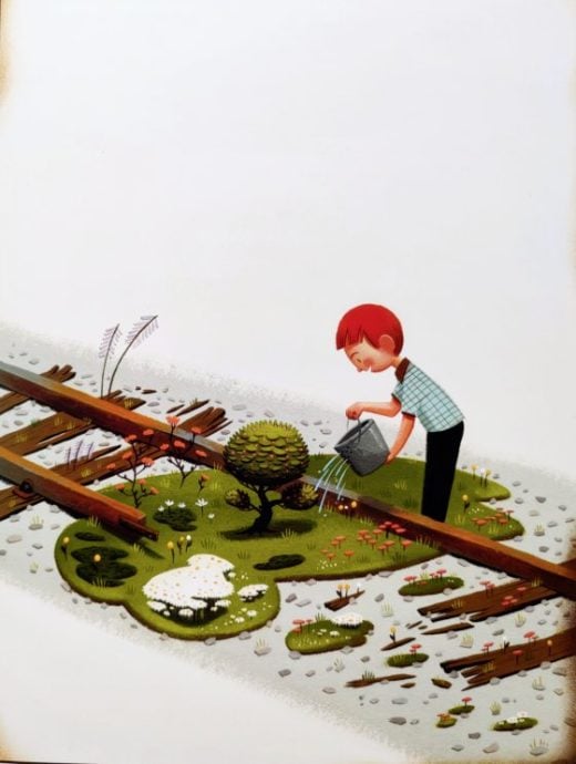 就这样,小莱鼓起勇气,跨出了楼梯井,走到废弃的老铁路旁。果然,这里没有人烟,一片荒芜,但铁道旁,错落长着一些奄奄一息的野花。男孩看着看着,下定决心,他要当园丁!