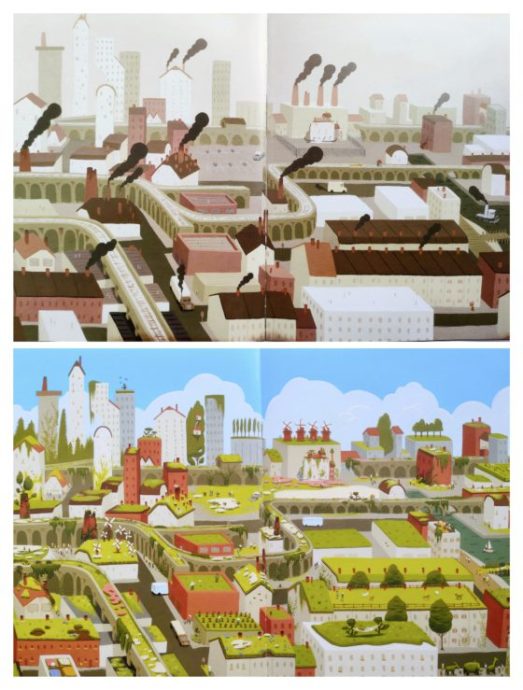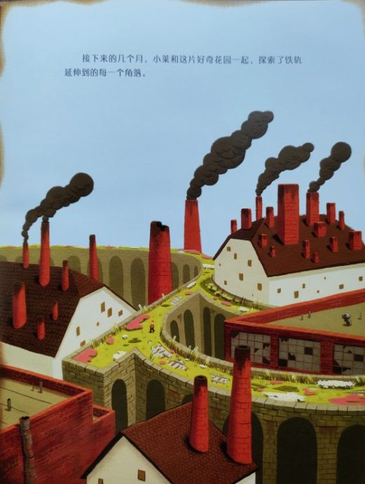 《好奇花园》的故事背景是一座城市,一座灰蒙蒙一片,了无生气的城市。故事的开头,就是到处冒着黑烟的烟囱,放眼望去,只见房子和工厂,没有花园,也没有一丁点绿植。这是一座沉闷又乏味的城市啊!