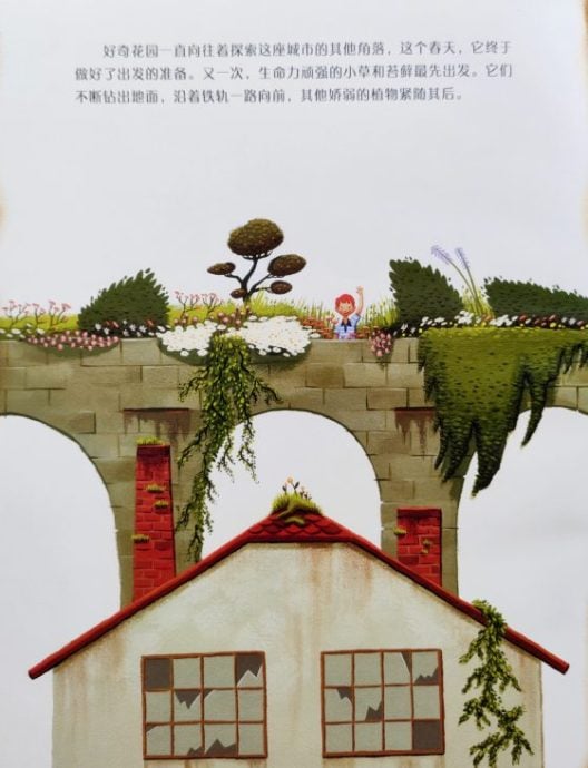 作者说:“在充满钢筋水泥的城市里,大自然似乎很难施展拳脚。但只要仔细寻找,就能在城市中看到野生的花丛、草地,甚至小森林。”这本绘本的灵感,源自纽约曼哈顿西区一条高架铁路改造的真实项目。