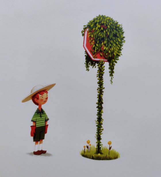 第二天,他回到铁轨上,开始给小花们浇水、修剪和唱歌!就这样,日子一天天过去,数周后,小植物渐渐有了长势!这座城市,开始有了颜色!