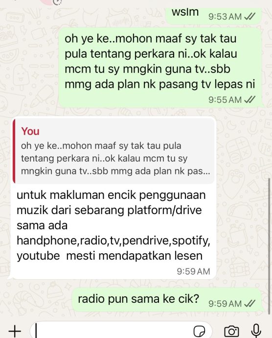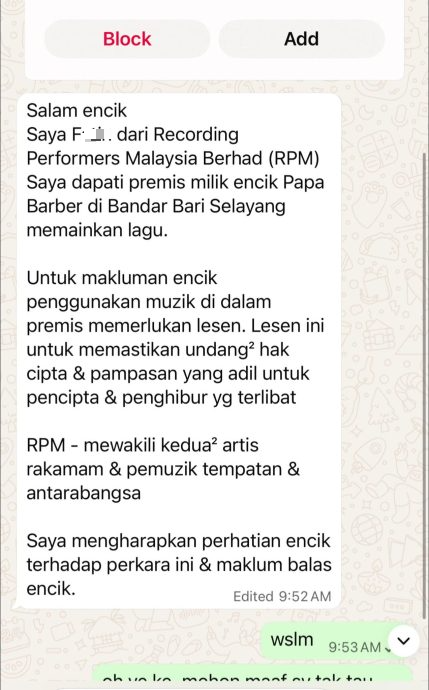 一名店主近日在社交媒体分享经历,指自己突然收到一则讯息,对方自称是大马唱片艺人协会(RPM)的代表,提醒其店内播放音乐涉及版权,须申请相关执照。