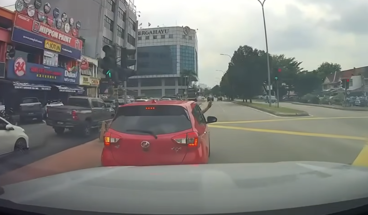 当后方司机不满而鸣笛提醒时,Myvi司机不仅没有立即驶离,还摇下车窗伸手示意,引起后方司机更大不满。