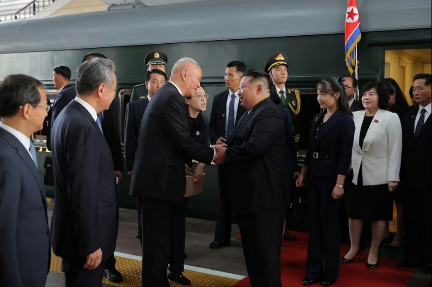 朝中社发布的照片显示中共政治局常委、中央书记处书记蔡奇及中国外长王毅在现场迎接,也显示金正恩的女儿金朱爱随行出访。