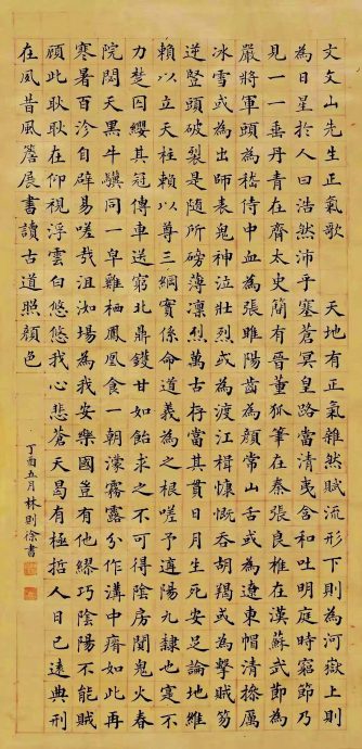晚清因“销毁鸦片”而驰名的政治家,善于书写《正气歌》,同时也表达了他对这种精神的认同和敬佩。他书写的《正气歌》被视为“千古辟邪第一书”,说的是这种精神可以抵御邪恶,能够激励人们追求高尚的道德情操和坚定的意志。林则徐的书法端庄大方(如图示),匀称明净,疏密得当,而且笔力遒劲稳实,看了有满满正能量的感觉。