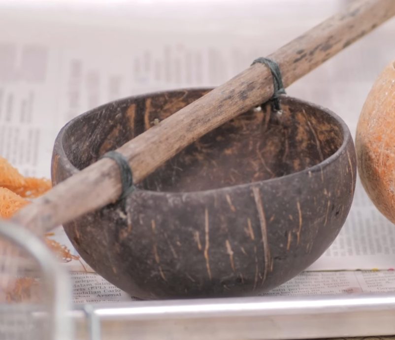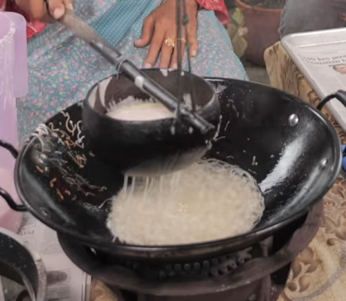 一个底部钻了无数小孔、装有长木柄的半边椰壳,里面装米糊,轻敲木柄,让米糊像下雨一样滴落油锅,千丝万缕纵横交织的网饼开始定形时,用两根竹签快手快脚折叠成扇形,全程必须在热油里一气呵成,因为一离开油锅饼就变硬,再也无法折叠。