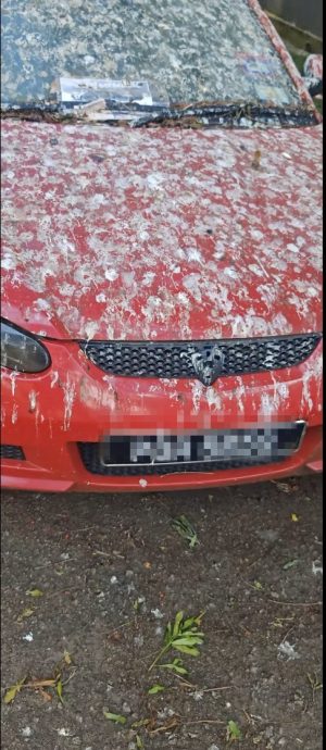 (新山5日讯)一辆长期弃在路边的轿车遭“空军集体泄粪”,被成群鸟儿在车上疯狂投下“炸弹”,导致整辆车布满鸟屎,场面惨不忍睹。
