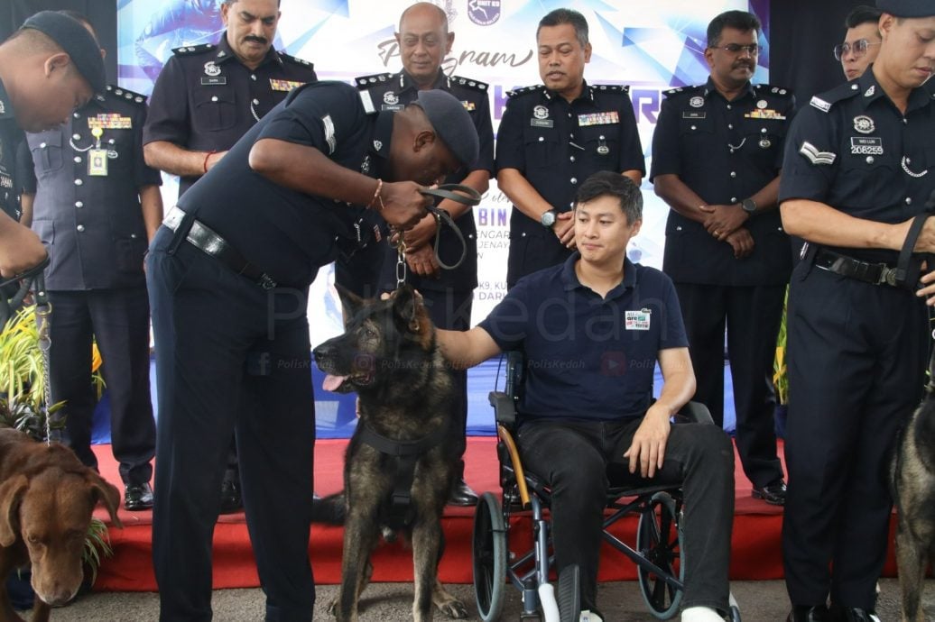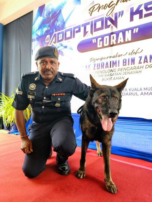 “作为先锋,一只名叫Goran的8岁K9警犬,来自捷克的德国牧羊犬,被移交给了霹雳州JSJ警犬警队(IPK)的李胜伟(译音,Lee Sheng Wey)督察。