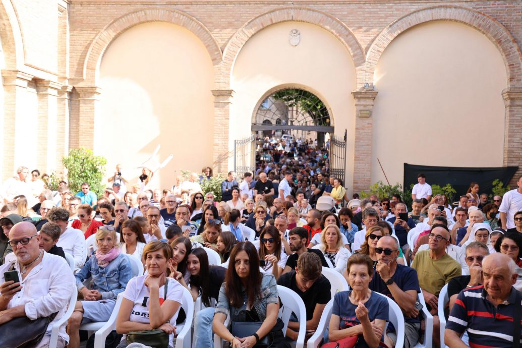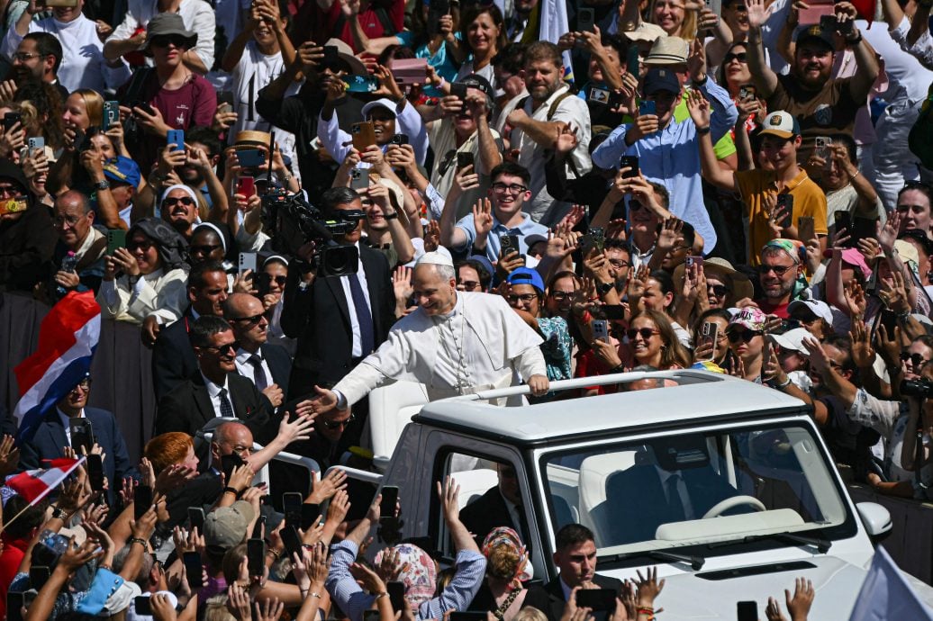 教宗良十四世在梵蒂冈圣伯多禄广场主持弥撒圣礼,除了与信徒握手外,也册封卡洛阿库提斯和弗拉萨蒂成为圣人。(法新社照片)