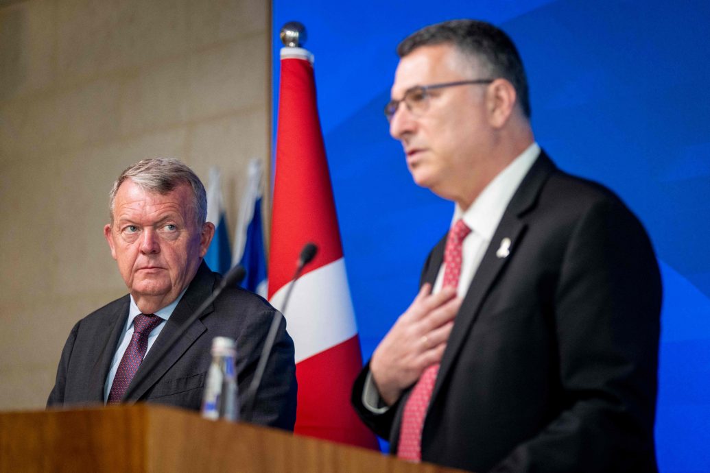 以色列外长萨尔(右)表示,承认巴勒斯坦国的努力是一项“错误”,在他身旁的是来访的丹麦外长拉斯穆森。(法新社照片)