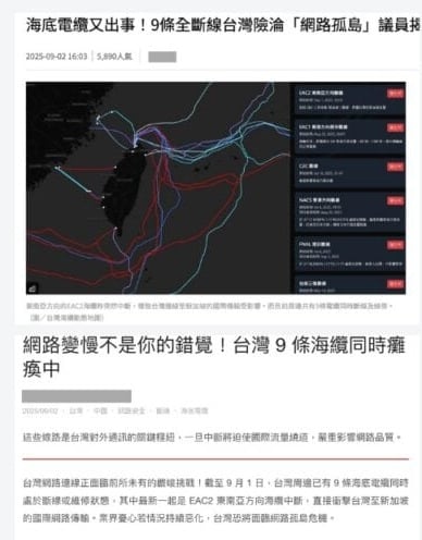 (八打灵再也5日讯)近日台湾社群与部分媒体流传“台湾内外9条海底电缆同时断线,台湾险沦网络孤岛”的说法,引发网民热议网速变慢,甚至担忧台湾是否失去对外连线。