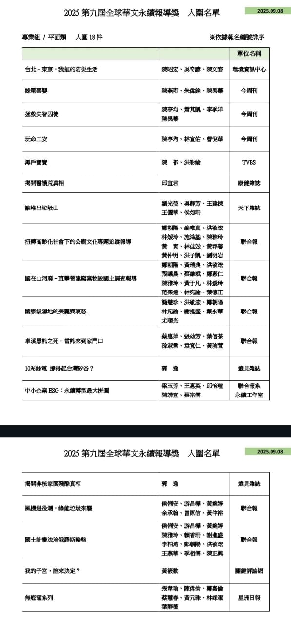 “历经严谨评审程序,共有123件作品脱颖而出;颁奖典礼将于10月19日(周日)下午举行,届时将揭晓各类组首奖、优等与社会价值奖得主,入围者受邀共襄盛举,为华文世界的永续新闻写下新篇章。”