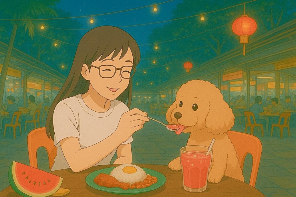 她随即转头一看,结果亲眼目睹一名女性狗主人,正在用美食中心公共餐具的汤匙,舀果汁喂自己的宠物狗。