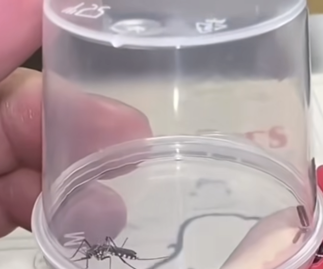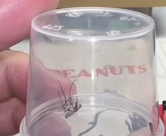 随后,他在盒子上戳一个小洞,并用打火机注入气体,困在其中的蚊子拼命挣扎,最终窒息而死。