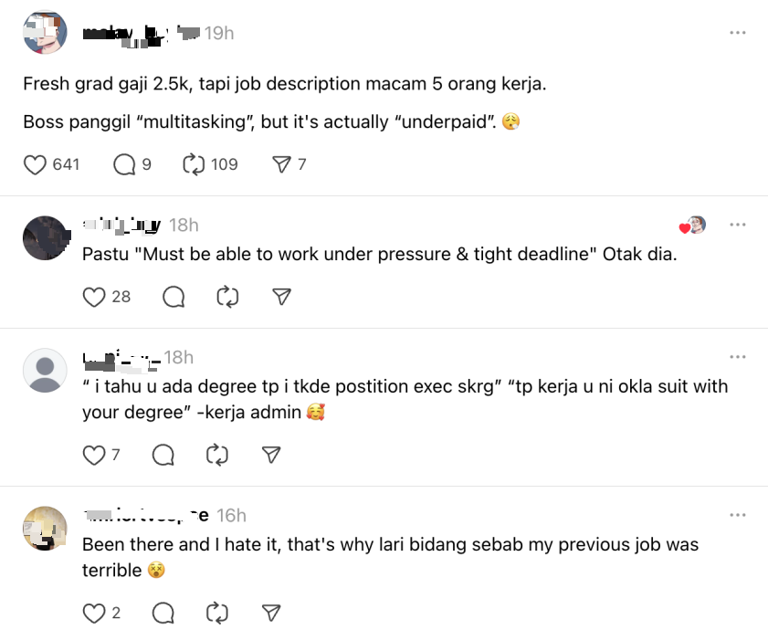 一名社会新鲜人日前在社媒Threads吐槽,自己第一份工作月薪仅有2500令吉,却需要处理多达5个人的工作量,引起网民热烈共鸣。