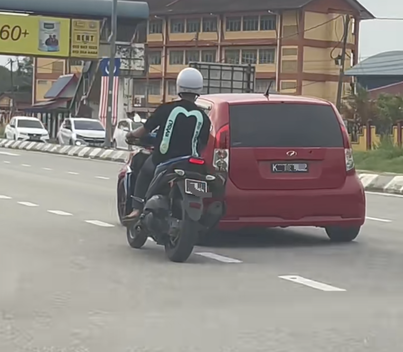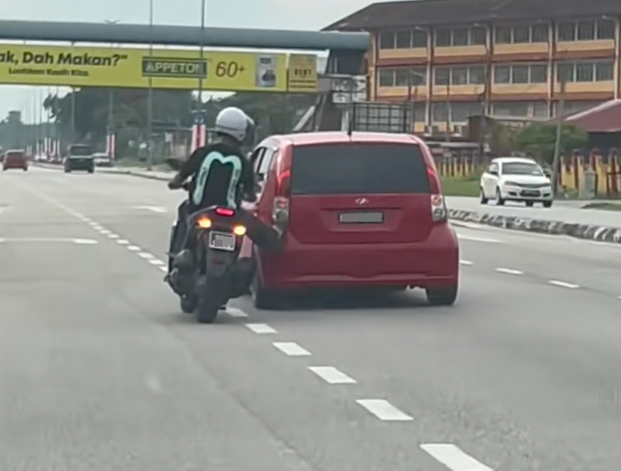 一名摩托车骑士眼见Myvi轿车因轮胎漏气而行驶缓慢,竟冒险以脚顶车助推,场面温馨感人,获网民大赞“无名英雄”。
