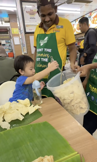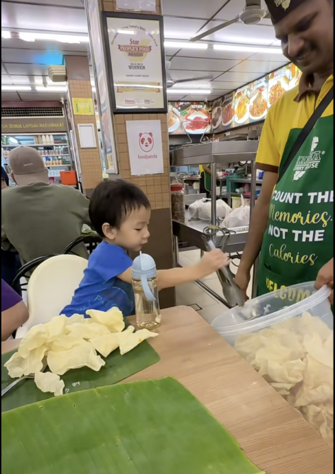 视频中可见,这名服务员将一整桶印度脆饼递到小朋友面前,还贴心地附上一个夹子,让小朋友自己挑夹放到香蕉叶饭上。
