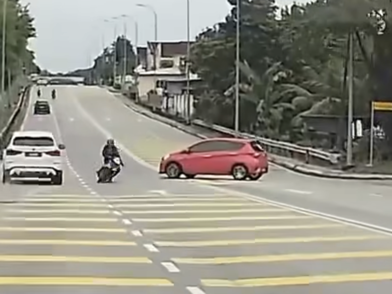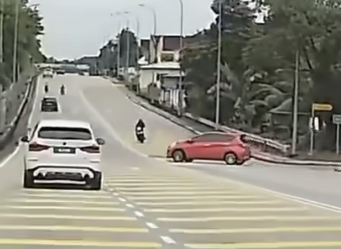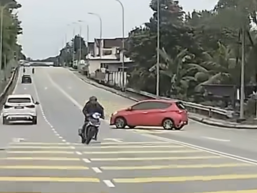 一辆Myvi轿车疑似贸然右转硬闯路口,险些撞上一辆正常行驶在主道上的摩托车,所幸骑士反应迅速,连人带车紧急摆动车头,车身几乎贴地,最终惊险避过,未发生意外。