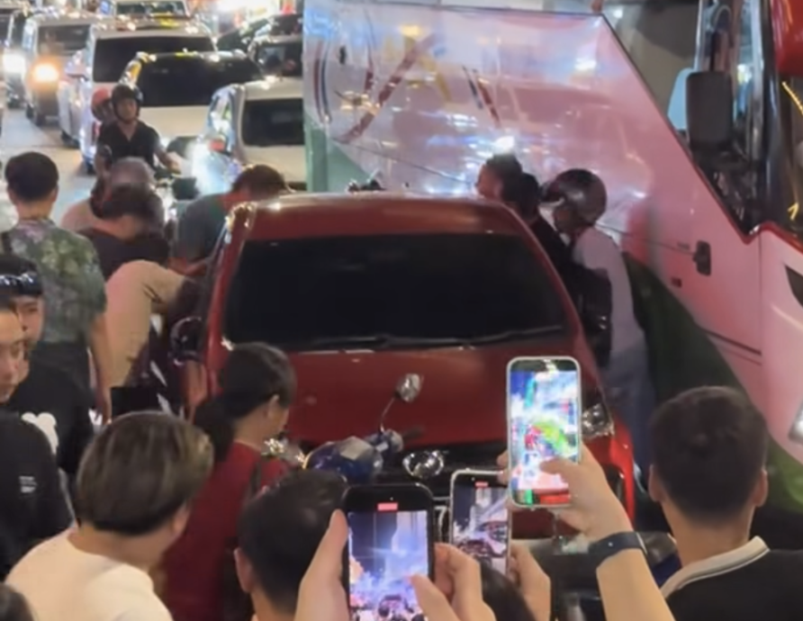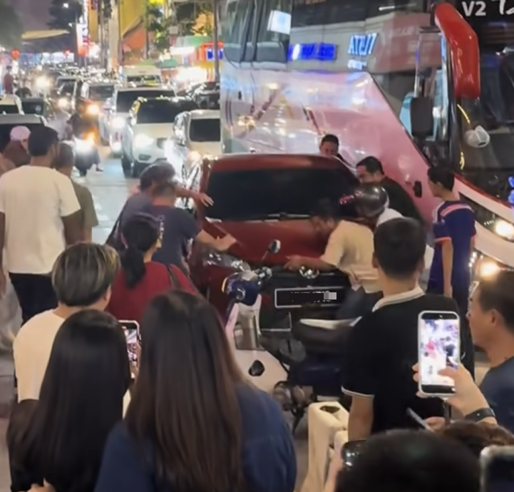 眼见情况僵持不下,数名路人自发走上前帮忙抬车,画面中可听见有人用英文高喊“123”,众人齐力将轿车移开一小段距离,让巴士顺利驶出。