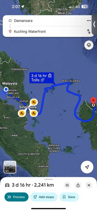 (吉隆坡17日讯)本地一名女子分享道,谷歌地图(Google Maps)竟然显示,人们可从西马雪州驾驶着车辆,“跨海”到东马砂拉越古晋,车程预计耗时3天16小时,直接让人大傻眼!