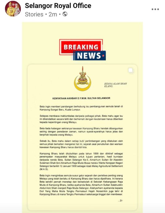 殿下今日透过雪州王室脸书专页发贴指出,不反对上述地点随时代发展脚步而进行重建;但其条件必须明确,而且必须有利于马来人。