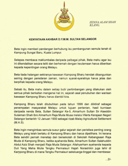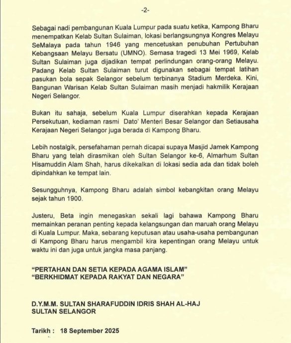 有鉴于此,雪州苏丹再次强调,甘榜峇鲁对马来人在吉隆坡的延续与尊严意义深远。凡涉及甘榜峇鲁的发展决策与举措,皆必须兼顾当下与长远的马来人利益。