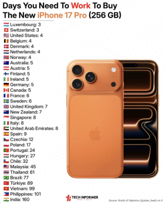 根据数据分析机构Tenscope最新公布的“iPhone可负担指数”(iPhone Affordability Index),该指数以每天8小时工作时长为基准,计算各国打工族需投入多少个完整工作日,才能负担得起一部最新款iPhone。