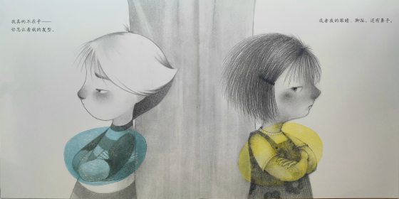 书店的推荐文是这样写的——“温柔的石墨笔触,让这本绘本阅读起来充满暖意。朋友不在乎彼此的外表、装扮,而表面上的这些小小差异,其实反而会让美好的友谊更加坚固。”