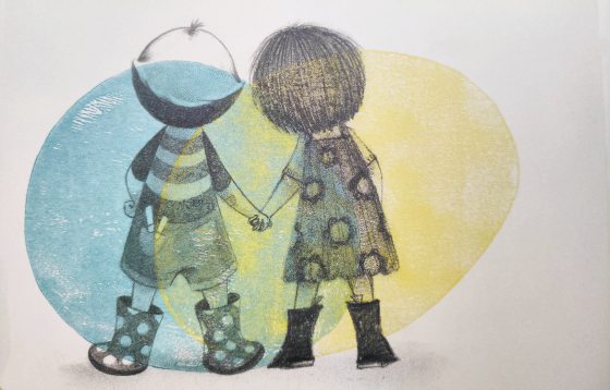 我也喜欢绘本里风格简约的图画和用色。其中一名绘者胡安娜就说了:“我们选择颜色的标准很简单,就是挑选各自最爱的颜色——蓝绿色和黄色。全书只采用这两种色彩,其他部分用黑铅完成。而关于选纸的部分,我们各自购买了大量纸张,一张张地试,结果我们喜欢的纸竟然是一样的!和好朋友一起,再难的事,也会变得简单,不是吗?”