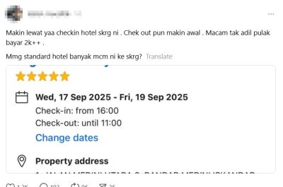 她在帖文中写道:“现在的酒店入住时间越来越晚,退房时间却越来越早。付了超过2000令吉,感觉很不公平。现在的酒店都是这样的吗?”