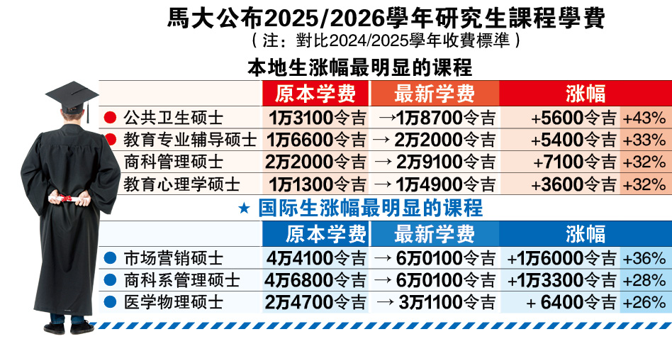 另一方面,马来亚大学在官网公布的2025/2026学年研究生课程学费,多项硕士课程亦出现明显调涨,部分科系本地生的学费涨幅超过五成,国际生也面临不同程度的上涨。