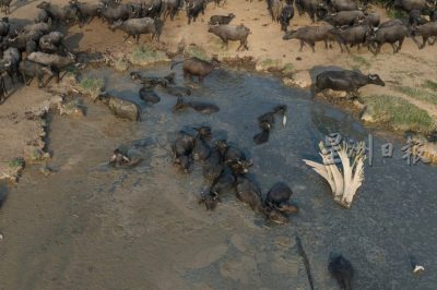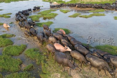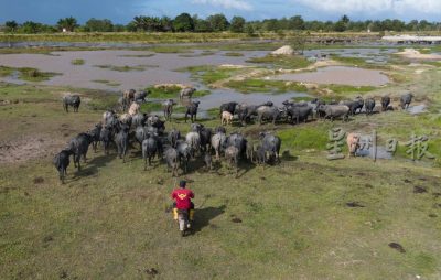哥打丁宜素里里的一望无际的旷野,传来一阵阵悠长的吆喝声,250多头体格健壮的水牛,在牧童的指挥下,缓缓走向草地,开始一天的放牧时光。