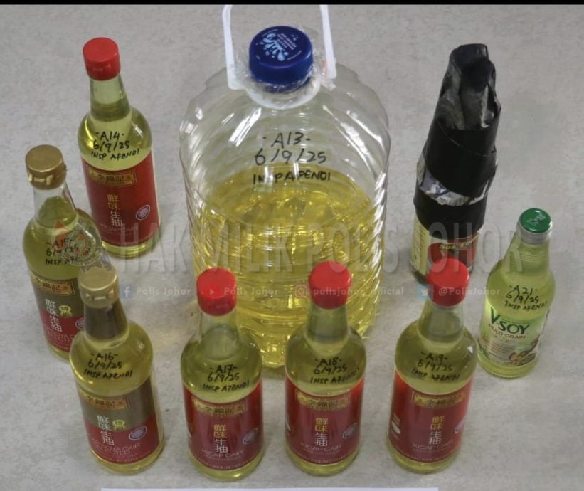 警方在逮捕现场起获汽油。(柔州警方提供)