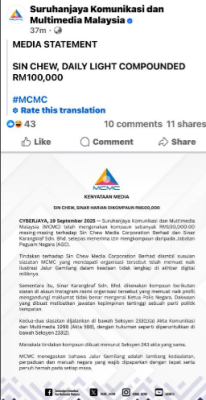 大马通讯及多媒体委员会(MCMC)对星洲媒体集团有限公司和《阳光日报》的出版公司Sinar Karangkraf私人有限公司各开出10万令吉罚单。由于惩罚过重,引起强烈反弹,不但媒体界群起非议,朝野政治人物也发言力挺媒体。
