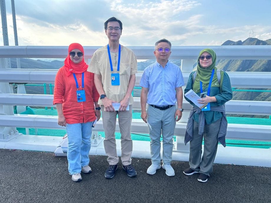 杨健(左)在高625公尺的大桥上,向东盟+ 3媒体团介绍花江峡谷大桥的特色。(陈汉光摄)