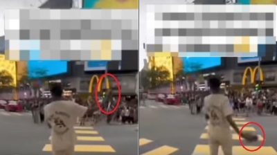 (八打灵再也25日讯)太恶劣了!两名被指是外籍人士的男子竟在吉隆坡市中心路口,假装拿起手上的砖头要砸向路人,疑似在拍摄恶搞影片,引发大马网民的愤怒和抨击,纷纷促警方抓人。