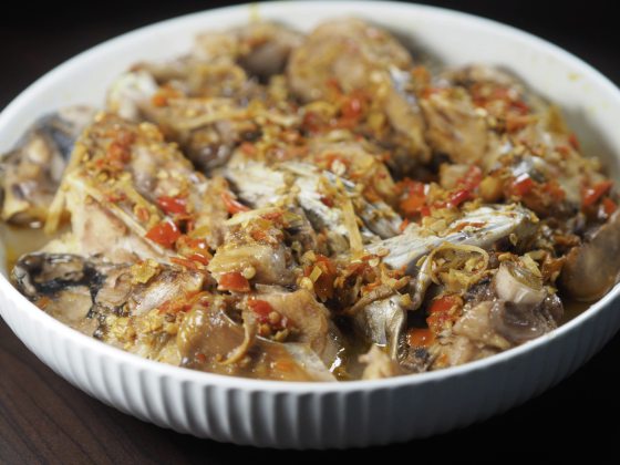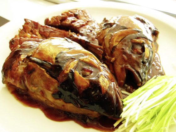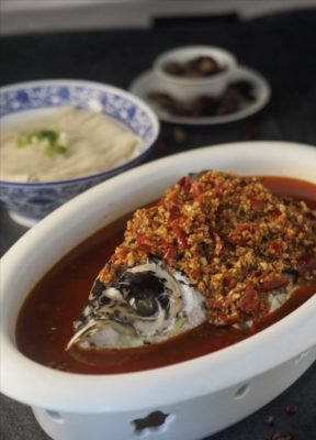 鱼头有很多做法,砂锅做法是混着热汤与火锅料,鱼头容易碎裂入汤里,配料过杂也使重点失焦;我会选剁椒或清蒸,才能专注地吃鱼头本身,因此我提早了一个月跟餐厅预订来自水库,用俗称大头鲢(鳙鱼)做成剁椒鱼头。