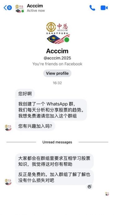 不法集团以“acccim.2025”在脸书注册假账号,并私信已添加的“好友”,指设立了WhatsApp群,并会每天分析和分享股票趋势,免费加入,疑企图以此方式进行诈骗。