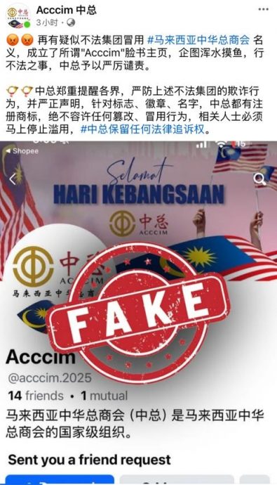 (八打灵再也26日讯)再有不法集团冒用马来西亚中华总商会名义开设脸书账号,企图浑水摸鱼,行不法之事,中总予以严厉谴责。