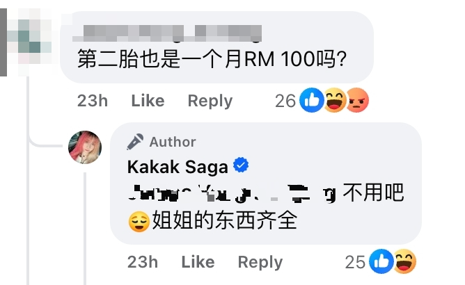 贴文吸引大批祝福留言,然而也有网民调侃询问:“第二胎也是一个月100令吉吗?”