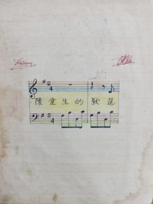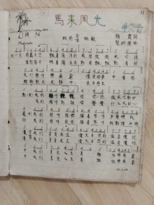 轻轻抚过公公的字迹,妈妈说这本书记录了他的一生。公公一笔一画地在《陈金生歌选》里留下了很多文字,我最喜欢看的是“捺”这笔画。我的目光停在“峇厘岛”的“峇”字,不知是否因为妈妈曾经告诉我,公公还有个名字叫“陈阿峇”,所以“峇”字特别吸引我。说着、说着,妈妈还记起公公喜欢吹口琴:“我小时候没有电视机,晚上我们就会坐下来听公公吹歌曲。”无缘当公公听众的我,只能盯着简谱幻想。随即居然感觉自己置身于妈妈叙述的情景,公公在那远去的时代里轻轻吹奏起舞的旋律。