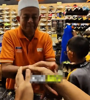 (八打灵再也3日讯)二手鞋店老板无偿送出一双球鞋给一名视障男孩,让陪同前来的祖父感动落泪,感人一幕在社交媒体上广泛流传,感动无数网民。