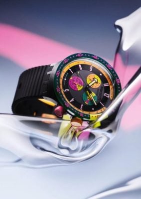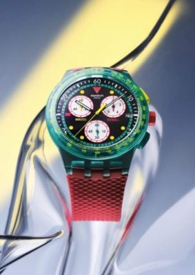 新上架的系列共设有6个款式,其中SWATCH NEON EMERALD CHRONO带复古设计的计时码表,灵感则源自80年代Swatch GENT表款中的典藏款EMERALD DIVER(GG703)。多色表盘采用具夜光效果的黑色时针与分针、黄色计时秒针,3点钟位置设日期视窗。雾面透明绿色表壳搭配同色系表圈,其上印有黄色测速计刻度,再搭配纹理雾面红色表带,更加出色。