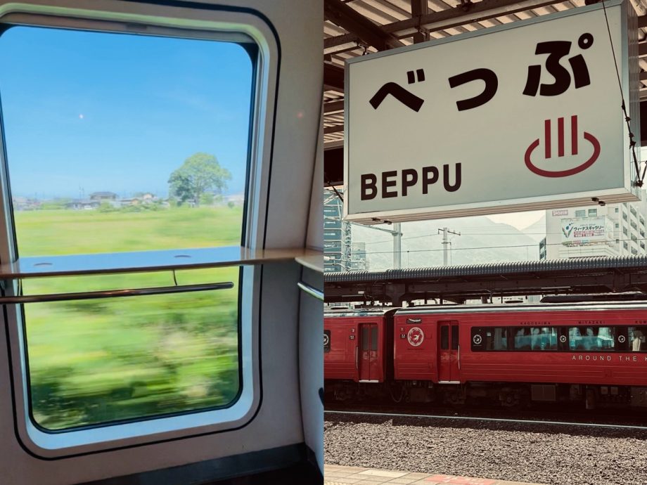 列车刚启程的时候,车厢还有些动静,但不久后,人声渐渐淡了下来。从博多往别府的路上,列车行驶异常平稳,而风景果然没有让我失望。山脉起伏,草原连绵,还有零星的村庄。偶尔穿过隧道,黑暗只是一瞬,随即又是广阔的景致。最后一段路,列车紧贴别府湾的海岸前行,海面时远时近,波光粼粼,无尽延展。