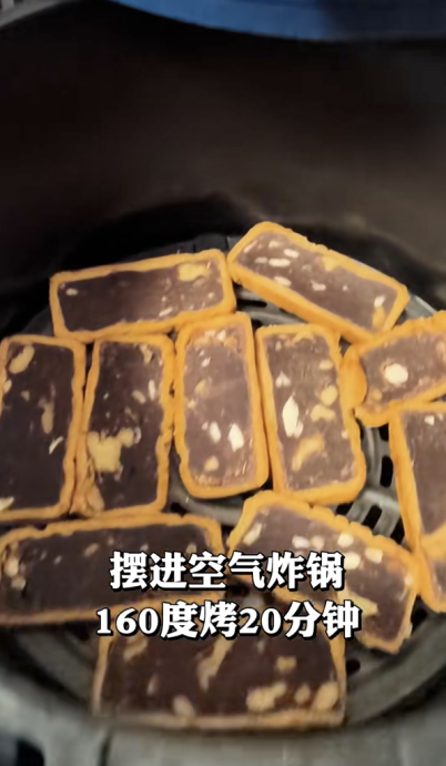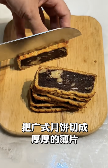 视频中,他先将广式月饼切成薄片,再放入空气炸锅,以160度烤约20分钟。