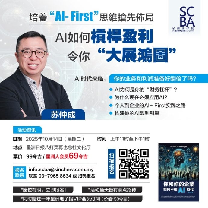 苏仲成将于10月14日,在星洲日报八打灵再也总社文化厅举行“企业如何部署不被AI取代?”讲座,票价为99令吉,星洲人会员可享有69令吉的优惠票价。成功报名者还可获赠一年星洲电子报VIP会员订阅(价值150令吉),座位有限,马上报名!活动当天现场还会备有茶点招待,千万别错过!