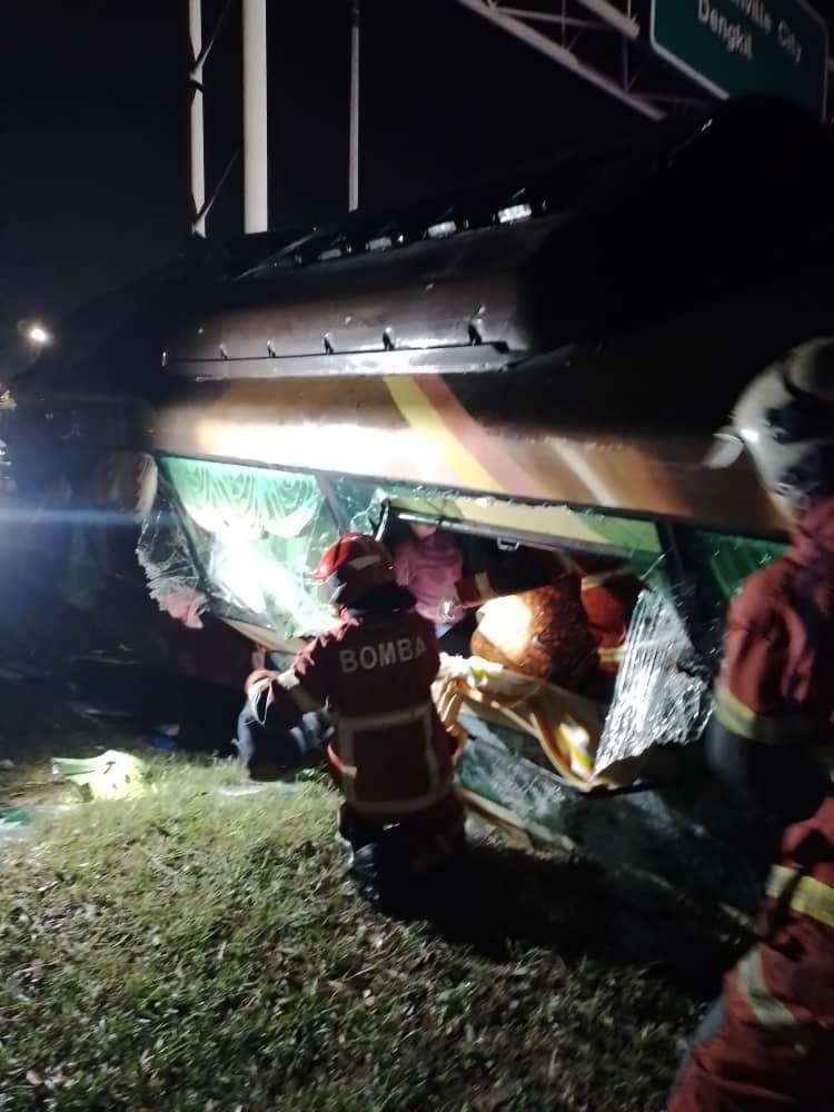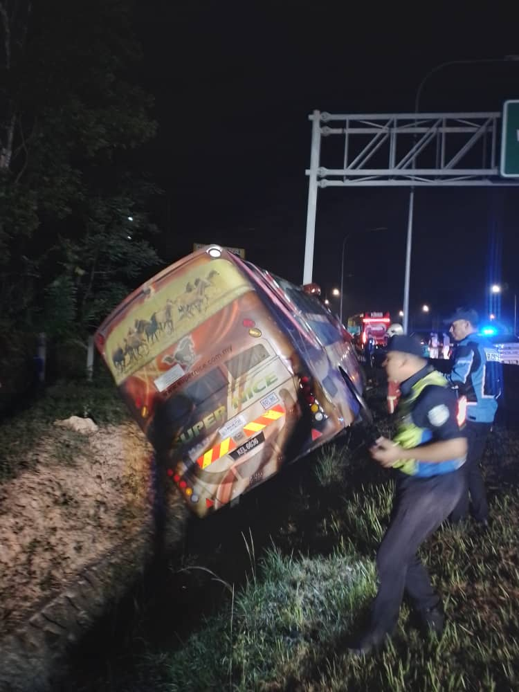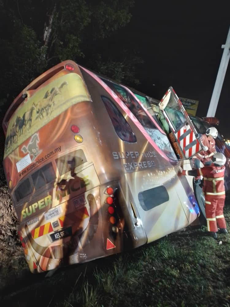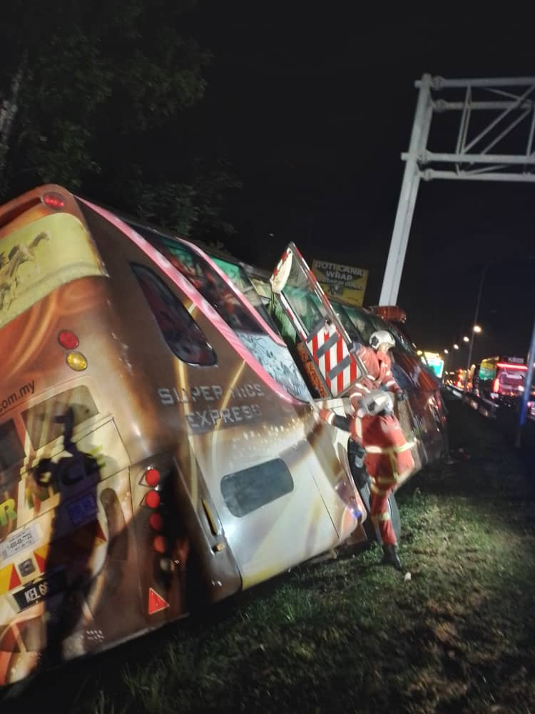 (八打灵再也11日讯)一辆从新加坡文礼驶向霹雳怡保的长途巴士在今晨途径南北大道靠近龙溪路段时,疑因失控猛撞路旁告示牌铁柱后翻覆,造成一名坐在巴士前方座位的男乘客伤重,当场身亡。