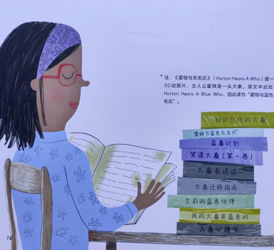 关心着小男孩的妈妈,从图书馆借来所有跟大象有关的书,开始研究。这些书包括了《认识悲伤的大象》、《笑谈大象(第一卷)》、《大象有话说》、《大象心理学》、《艾莉的蓝色伙伴》等。(面对负面情绪,父母会手足无措,却也总积极学习,希望带给孩子帮助。)