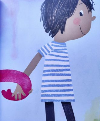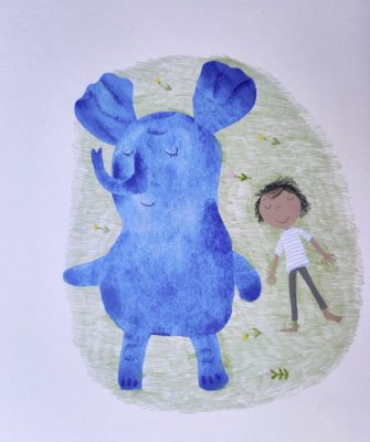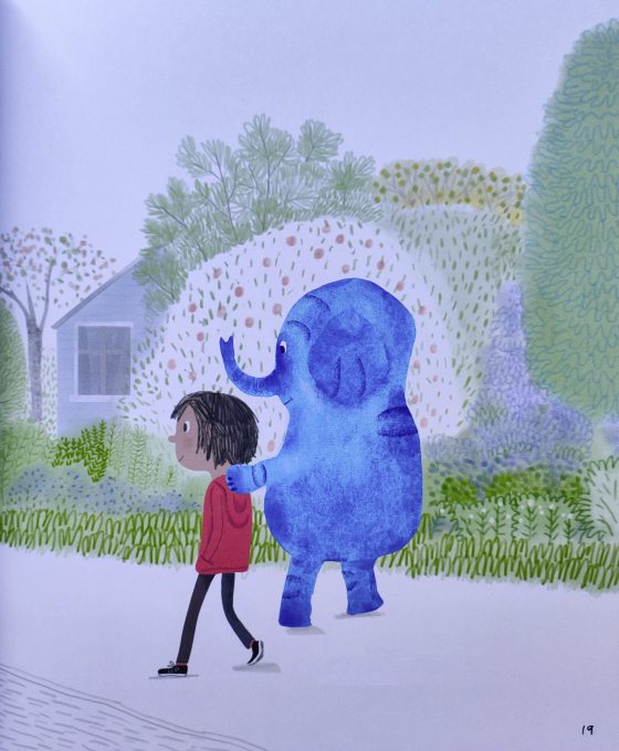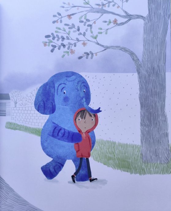 当蓝色大象来访。别怕。带着她沿着街区慢慢地走,带着她躺在草地上感受微风轻拂,带着她去感受阳光的温暖,带着她跟邻居朋友轻声打招呼,带着她去踢球,带着她做自己喜欢做的事……带着她,就这样带着她,然后,她就会开始变成粉红大象。